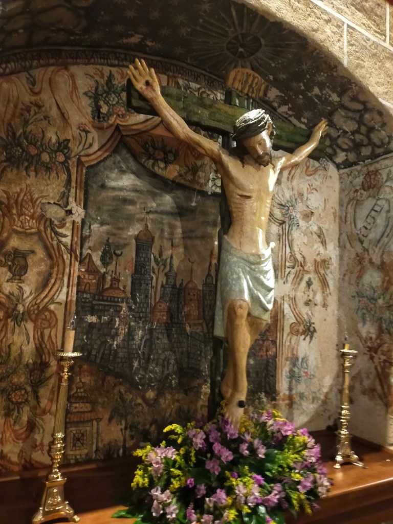 La imagen se encuentra en una hornacina cuyo fondo está decorado con una pintura, bastante deteriorada, que representa a la Jerusalén Celeste enmarcada por una orla de carácter vegetal que sirve a su vez para albergar los elementos de la Pasión de Cristo entre los que vemos la lanza y la caña con la esponja, la fusta y la columna, la escalera o los dados de los soldados.
